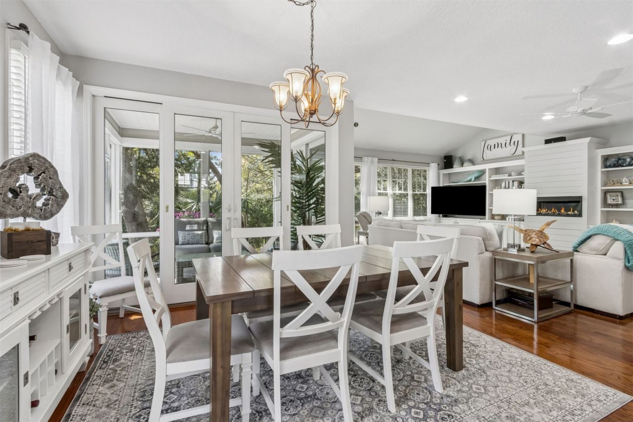 There is a quiet exclusivity to life in Little Dunes. This Nantucket-style townhouse offers a rare opportunity to enter one of the most sought-after enclaves within the Amelia Island Plantation. Beyond the covered front porch, the residence opens into a light-filled sanctuary featuring an open-concept layout anchored by rich hardwood floors and a modern linear electric fireplace. A wall of windows draws serene views and natural light into the main living area, which is lined with built-ins. The home overlooks a private dock and peaceful lagoon, offering a level of privacy and natural beauty that is hard to find. The thoughtfully designed floor plan includes a versatile loft sitting area and an oversized second guest ensuite scaled to fit multiple sleeping arrangements. Functional features include a full laundry room with a utility sink, cabinets, and counter space, plus a screened-in porch perfect for morning coffee. Tailored for the island lifestyle, the property includes a private outdoor shower and a carport with secured storage closets, hooks for bikes, and dedicated space for your golf cart. Just steps from the Atlantic and the community pool, this home is offered unfurnished; however, furnishings and a six-seater golf cart are negotiable.