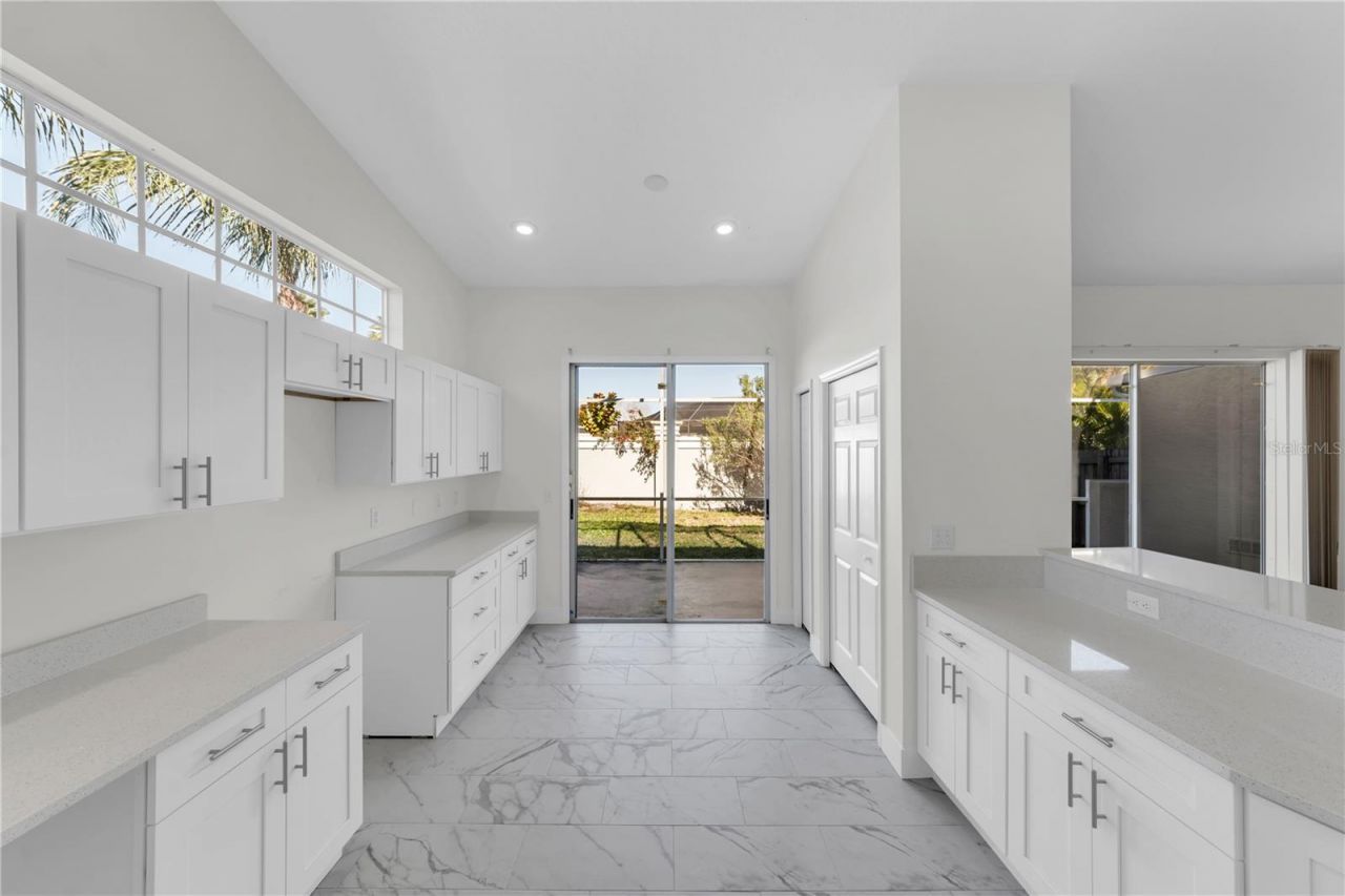 Welcome to this immaculate, fully upgraded, and truly move-in-ready townhome located in the highly desirable gated community of Eagles Reserve at Boot Ranch. Perfectly positioned near premier shopping, dining, beaches, and major airports, this spacious three-bedroom, two-bath residence with a two-car garage offers 1,870 square feet of thoughtfully designed living space and exceptional pride of ownership throughout. From the moment you enter, soaring high-volume vaulted ceilings and abundant natural light create a bright, open, and inviting atmosphere. The beautifully updated kitchen is a showstopper, featuring modern white shaker soft-close cabinetry, abundant storage, and stunning quartz countertops that extend into a bar-top overlooking the expansive great room. High-end marble-look porcelain tile flooring recessed can lighting, a built-in reach-in pantry, and an array of windows-including a large transom window-make this kitchen as functional as it is elegant. A sliding glass door provides seamless access to the fully screened rear patio, ideal for indoor-outdoor living. The oversized great room is perfect for entertaining and everyday living, highlighted by vaulted ceilings, waterproof, scratch- and dent-resistant luxury vinyl plank flooring, recessed lighting, a skylight, and another sliding glass door leading to the screened lanai. This open layout easily accommodates large gatherings while maintaining comfort and style. The primary suite is generously sized to fit large furnishings and features a beautiful bay window, vaulted ceilings, recessed lighting, luxury vinyl plank flooring, and dual walk-in closets offering exceptional storage. The elegant en-suite bathroom showcases porcelain tile, a white shaker vanity with soft-close drawers and doors, dual under mount sinks with quartz countertops, a relaxing garden tub, and an oversized step-in shower. Bedrooms two and three are both oversized and equally impressive, offering vaulted ceilings, recessed lighting, luxury vinyl plank flooring, and transom windows that flood the rooms with natural light. The secondary bathroom is centrally located and features porcelain tile flooring, a tub/shower combination, and a shaker-style vanity with quartz countertop and soft-close cabinetry. Additional highlights include an interior laundry room leading to the two-car garage with porcelain tile flooring, and a large fully screened concrete patio/lanai perfect for grilling, entertaining, or relaxing in privacy. The backyard is fenced with a six-foot concrete block wall, providing exceptional seclusion. Located in a non-flood zone, this community offers low-maintenance living, with the association covering exterior maintenance, groundskeeping, painting, driveway upkeep, roof replacement, and amenities including a community pool, clubhouse, and tennis/pickleball courts. All this for only $343.00 in monthly HOA fees. This home sits directly adjacent to the pool and tennis courts, offering unmatched convenience. Spacious, stylish, and meticulously updated-this exceptional townhome is the definition of turn-key Florida living.
