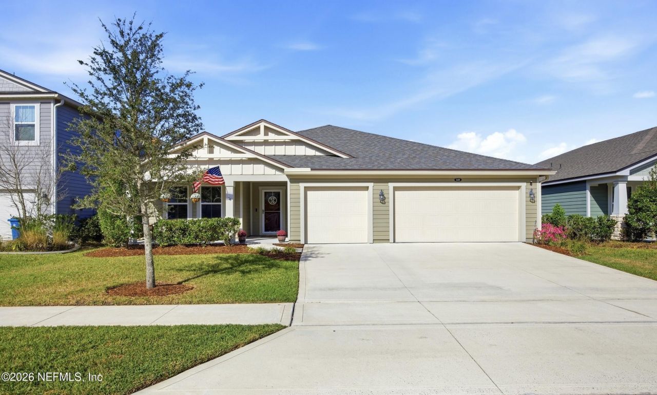 Welcome to this beautifully maintained home in the highly desirable Rivertown community, featuring an ASSUMABLE MORTGAGE that creates a unique opportunity for qualified buyers. From the moment you arrive, the inviting front porch greets you with a relaxing swing and charming storm door that allows natural light to pour inside, setting tone for the warm and welcoming feel throughout the home. Inside, you'll find a spacious open split floor plan decorated in attractive neutral tones, enhanced by engineered hardwood flooring in the main living areas and soft carpeting in the bedrooms. The stunning kitchen featuring quartz countertops, stainless steel appliances, a gas range for cooking, a large center island, and an abundance of cabinetry, make it ideal for both everyday living and entertaining. The light-filled living and dining areas flow seamlessly together, creating an airy and comfortable space for gatherings. Remote-controlled blinds on the sliding glass doors provide both convenience and privacy while opening to a delightful patio area. The expansive primary suite offers a peaceful retreat with dual closets and a well-appointed ensuite bath. The guest bedroom with its own ensuite bathroom provides comfort and privacy for visitors. Additional highlights include: Quartz countertops in kitchen and bathrooms, updated fans/light fixtures large bonus/flex area perfect for a playroom, media room, or office, three-car garage, water softener system and a full gutter system installed in 2025. Perfectly located near Rivertown's incredible resort-style amenities, residents enjoy access to pools, trails, parks, fitness facilities, and the scenic St. Johns River. This move-in ready home combines thoughtful upgrades, generous living space, and a fantastic location. Schedule your tour today!