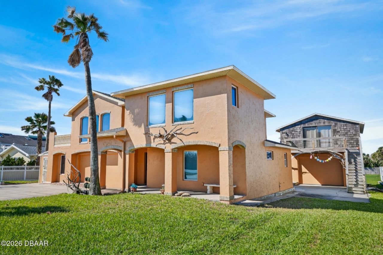 Experience the ultimate coastal luxury in this stunning Ormond-By-The-Sea gem, perfectly situated on a sprawling double lot! This exceptional property was completely re-built in 2007, it features two meticulously maintained residences, boasting new roof and impact-resistant windows and doors, offering breathtaking ocean views from nearly every room. Situated on the highest point of the island above sea level, both the main home and the charming guesthouse are built of solid concrete foundation and poured concrete walls, overlooking 195 feet of pristine shoreline, complete with littoral rights.Step inside to discover sun-drenched living spaces, gourmet kitchens, and thoughtfully designed master bedrooms that celebrate a coastal heritage and water views from every room. The distinctive entryway welcomes you with a breathtaking circular staircase adorned with exquisite wrought-iron details, a theme that continues throughout the home. Richly textured walls, beautiful tilework, and reclaimed driftwood accents evoke the elegance of Spanish Revival architecture, creating a warm and inviting atmosphere. Indulge in the luxurious primary suite, featuring a custom walk-in closet and a spa-like ensuite bathroom, complete with a stunning artisanal glass shower and a relaxing soaking tub. The contemporary 1-bedroom, 1-bath guesthouse impresses with two private balconies that offer spectacular views to the East and West, perfect for enjoying enchanting sunrises and sunsets.Designed for the ultimate entertainer, the backyard paradise boasts multiple seating areas on a spacious patio that mimics a pier, along with a well-appointed tiki hut complete with a bar and cocktail tables. After a day at the beach, rinse off in the outdoor shower, highlighted by a custom shell wall. The lush lawn provides ample space for recreational activities, with room to add a swimming pool if desired.A private walkway to the beach leads directly to your expansive private deck overlooking the surf, with a permitted boat rack, featuring built-in seating to savor the refreshing sea breeze, or venture down to the soft sands and surf. Additionally, enjoy 2 generous garages one of which is extra long to store water craft, and two historical anchors reclaimed from 18th-century provision ships, adding a unique touch to the curb appeal.Don't miss your chance to own this extraordinary coastal oasis schedule your private showing today before this rare opportunity slips away!
