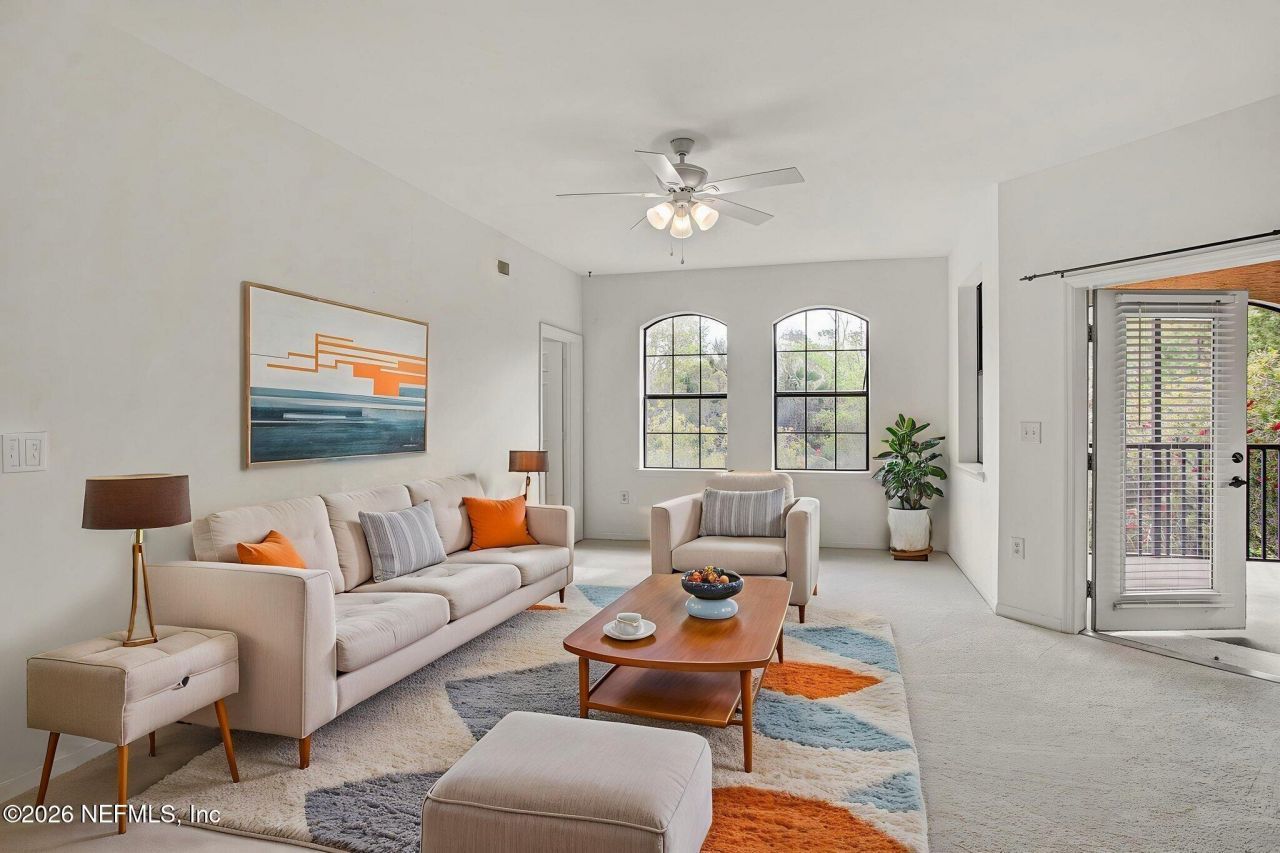 Welcome to your private retreat in the heart of historic St. Augustine! Nestled within a quaint, gated community with lush, mature landscaping, this beautifully maintained single-level end-unit condo offers comfort, privacy, and natural light throughout. The open, airy layout flows seamlessly to a spacious screened lanai with serene views of trees, flowers, and abundant birdlife. The well-designed floor plan lives large and includes all new upgraded carpeting throughout and a rare generous full sized garage. Enjoy resort-style amenities including a clubhouse with a 240 sq ft conference room, a 1,000+ sq ft pool with expansive deck and covered seating, and a separate temperature-controlled saline lap pool. The fitness center features weights, cardio equipment, WiFi, and more. Scenic trails wind through conservation areas, and a community pier on the San Sebastian River is perfect for fishing and photography. Internet included in HOA dues and RV storage available onsite.