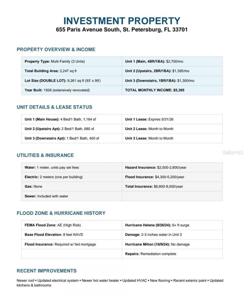Triplex investment property with $5,400 in gross monthly income, located on a double lot with one vacant parcel. Buildable lot letter pending. The front structure consists of a four-bedroom bungalow, while the rear alley-accessed building is a two-story duplex with two-bedroom, one-bath units. One unit is leased month-to-month. Property features include shared on-site laundry and extensive rear parking. Updates include new roofs (2022), select new windows, fresh paint, and PVC plumbing. Insurance requirements include liability and flood coverage for both structures; elevation certificate provided to remove the main house from flood insurance. Property is located in an up-and-coming area of St. Petersburg near Bartlett Park, Old Southeast, and Downtown St. Pete.