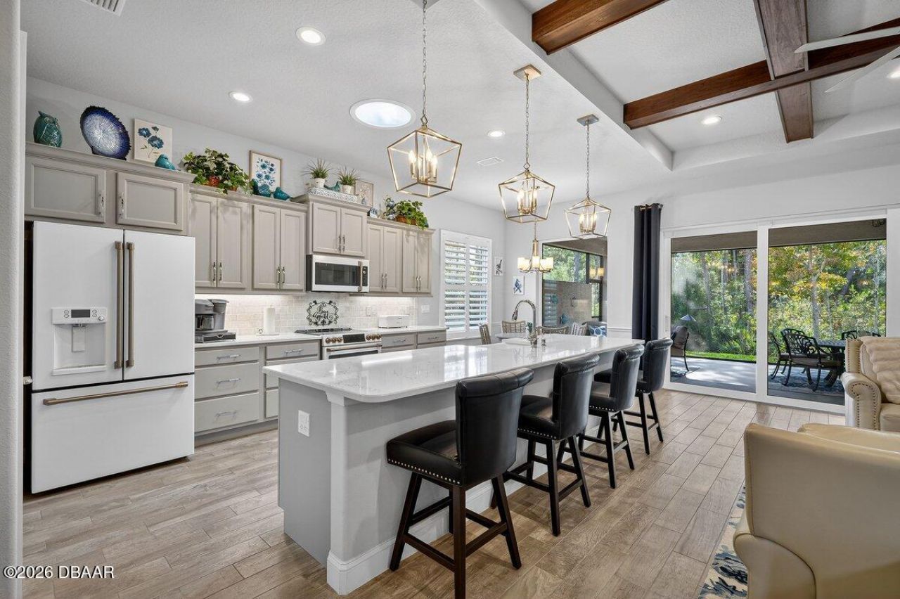 Welcome to this three-bedroom, two-bath home located in the gated Pinnacle Park community of Port Orange. As you approach, you'll notice the attractive stacked-stone front elevation, decorative curbing, and extra-wide driveway that enhance the home's curb appeal. The decorative glass front door opens to an inviting open floor plan with 10-foot ceilings, tile plank flooring throughout the main living areas, and plantation shutters. The living room features a stained wood beam ceiling and a quartz stacked-stone, wood-burning fireplace with a wood mantel, while a triple sliding glass door, sun tunnels, and a chandelier with wall sconces in the dining room fill the home with natural light. The kitchen is designed for entertaining and everyday living, offering Café appliances in a white matte finish, extended cabinetry with crown moulding, an impressive 11-foot quartz island with a white farmhouse sink, and three pendant lights as a focal point. The primary suite includes upgraded carpet and padding, a spacious walk-in closet, and a well-appointed bathroom with a double-sink vanity and walk-in shower. Step outside to enjoy the extended rear patio featuring a panorama screen, two ceiling fans, and a privacy wall, creating a peaceful outdoor retreat overlooking the greenbelt. Additional highlights include an upgraded Carrier 15 SEER A/C system and access to community amenities such as a gated entrance, clubhouse, and community pool. Conveniently located near top-rated schools, shopping, restaurants, golf courses, and beautiful beaches, this home offers comfort, style, and an exceptional location. Schedule your private showing today.
